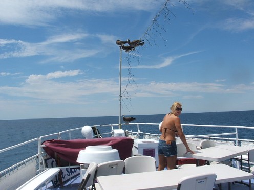 Aquí están 4 polizontes obteniendo un viaje gratis a la isla. Todos dejaron la cubierta para no espantarlos y que se fueran. Convencí a esta señora de que podría subir a la cubierta y que al pájaro no le importaría su presencia para poder tomar la foto.