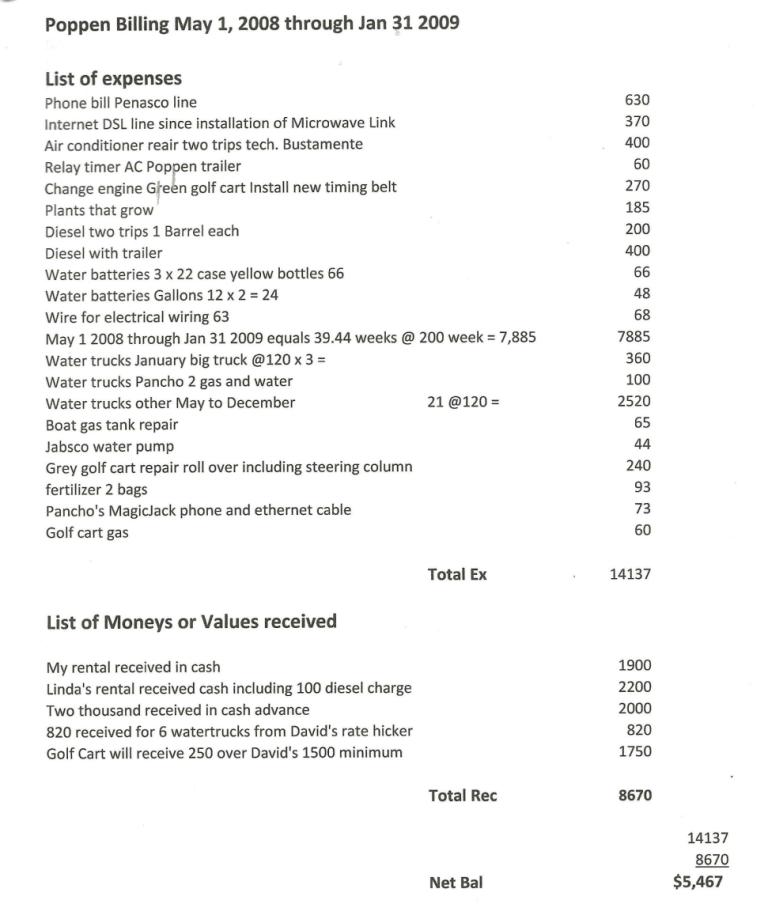 Below is a billing David Poppen paid, therefore this billing they received with the explanation list above they approved. This was a billing for a 9 month period they approved and paid in 2 payments. Here you will see the billing for the Peņasco Phone line I had installed for them in my wifes name. The next item is for the telephone line installed in my house that I transmitted to the Sand Castle 25 miles away using an antenna tower in my house with 2 antennas and an antenna system in the Sand castle. This transmision systm was free to them at my expense. Pictures of this system are on the page of "free items" I regret doing for free. The rest of the items on the list showed that I paid the ongoing expenses out of my pocket. The attorneys that I have spoken with point out how trusting people like this was wrong. My experience however With high class people in the United States won my appreciation and bonuses. I seemed to have made a mistake thinking that David and Linda Poppen were high class. They make reference in their email that I received money from renters when they were gone. Well they were right and all monies received were listed and reduced the billing from $14,137 by $8,670 to the $5,467 which they paid.